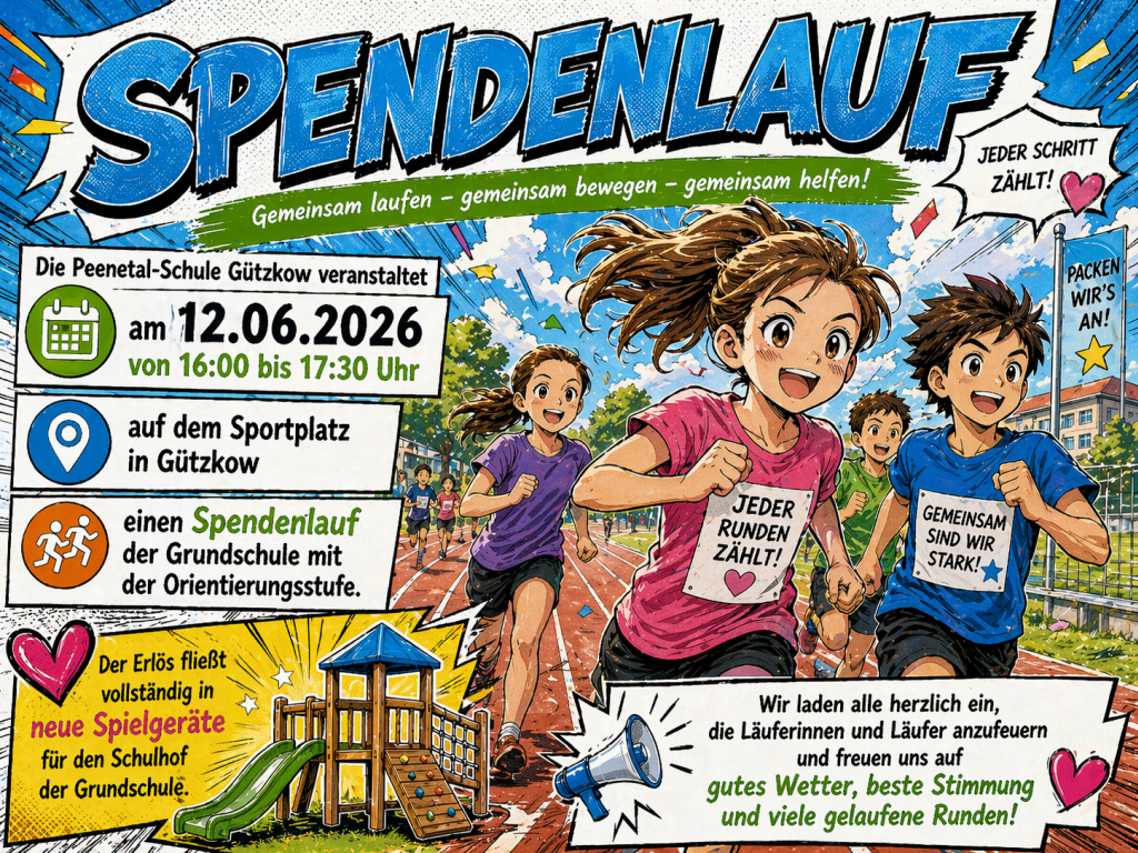 Die Peenetal-Schule Gützkow veranstaltet am 12.06.2026 von 16:00 bis 17:30 Uhr auf dem Sportplatz in Gützkow einen Spendenlauf der Grundschule mit der Orientierungsstufe.