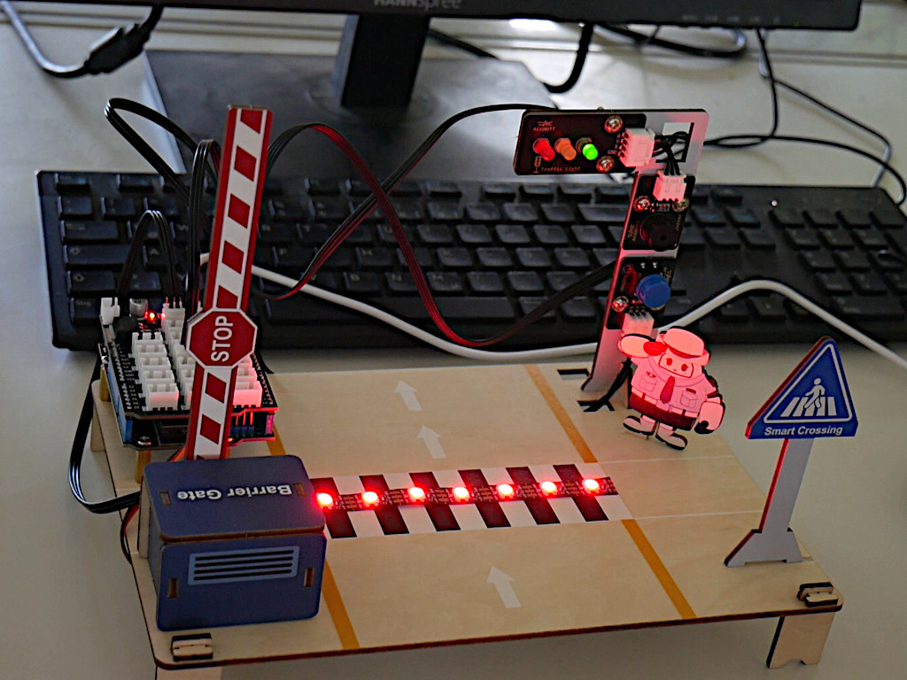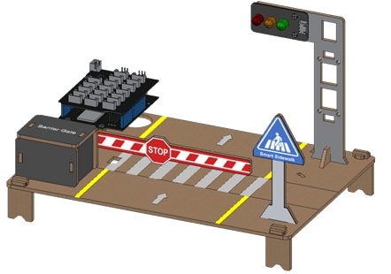 - Verwendet einen Servomotor, um das Öffnen und Schließen einer Schranke zu steuern. Wenn die Ampel auf der Fahrspur rot ist, wird die Schranke geschlossen, um Fahrzeuge und Fußgänger zu trennen. Wenn die Ampel grün ist, wird die Schranke geöffnet und die Fahrzeuge können passieren.