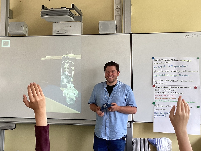 Er erzählte von seiner Religion und zeigte gleich zu Beginn ein Video aus der Synagoge in Potsdam. Die Schülerinnen und Schüler stellten Fragen zu den Gegenständen, die sie gesehen haben. So haben sie zum Beispiel erfahren, dass die Tora, das Heiligste im Judentum, wie eine Königin behandelt wird. Damit war das Gespräch eröffnet. Es ergaben sich viele Fragen von selbst, die Nik alle beantwortet hat. Einiges hatten die Schülerinnen und Schüler sich im Vorfeld schon überlegt und konnten nun ihre Fragen stellen.